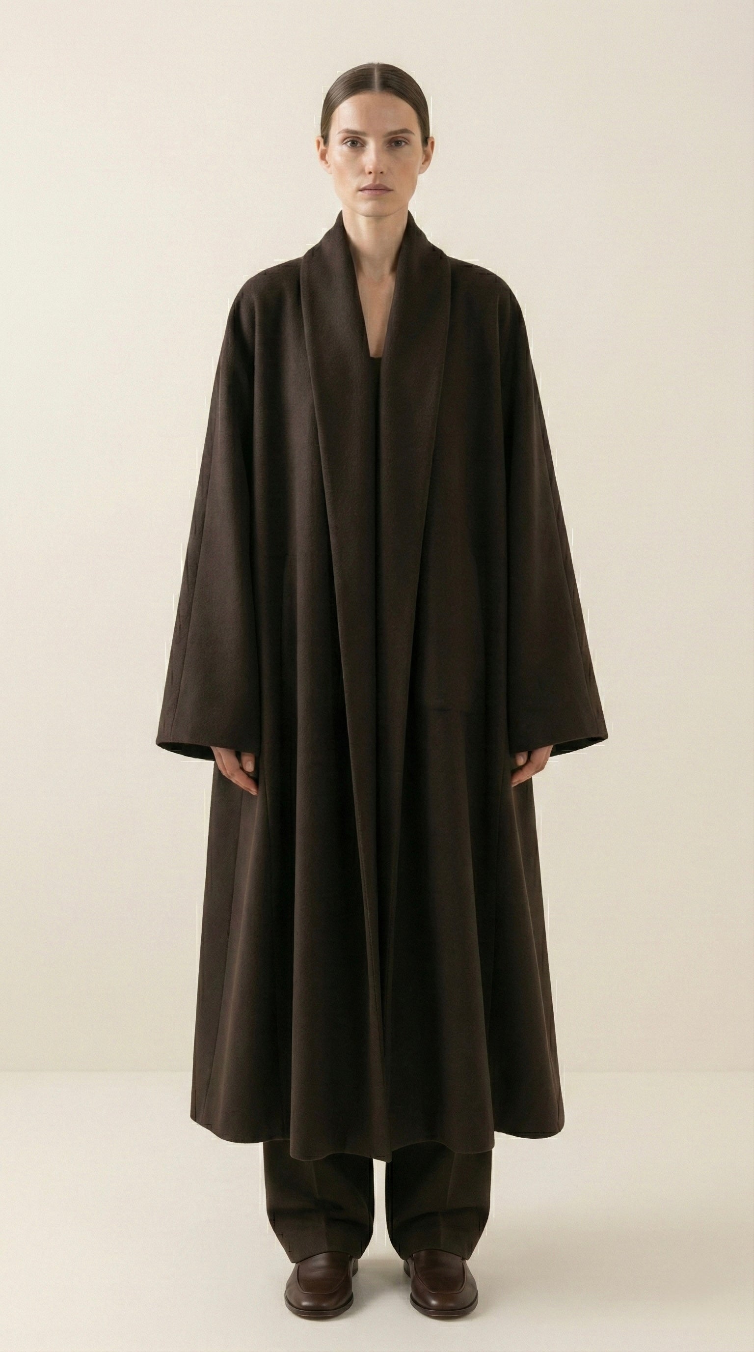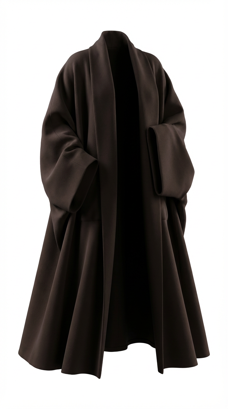 This is a seasonless piece: it works as a light coat, an abaya, or a design layer. Ideal for those who seek formal purity, real comfort, and strong visual impact.