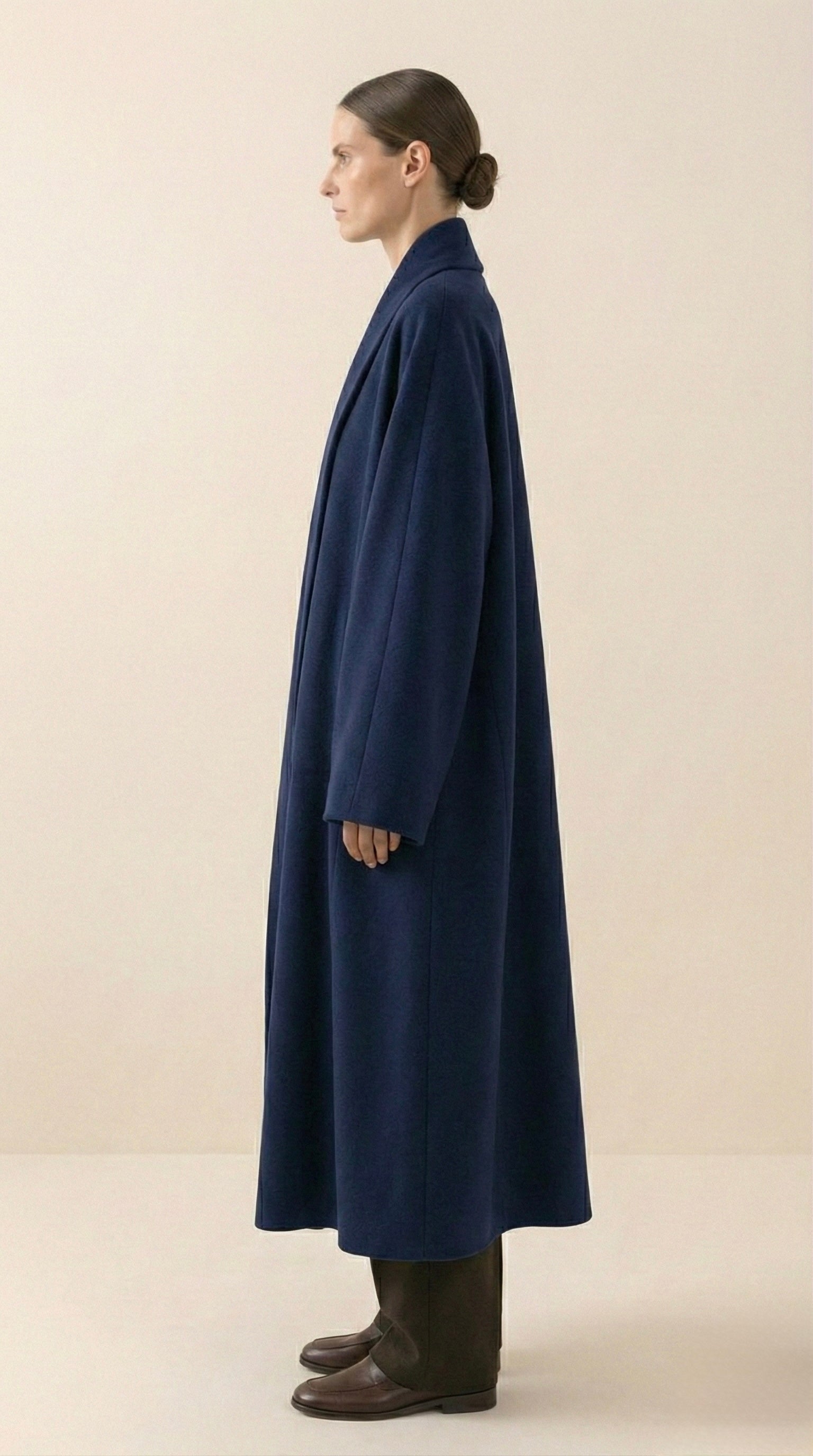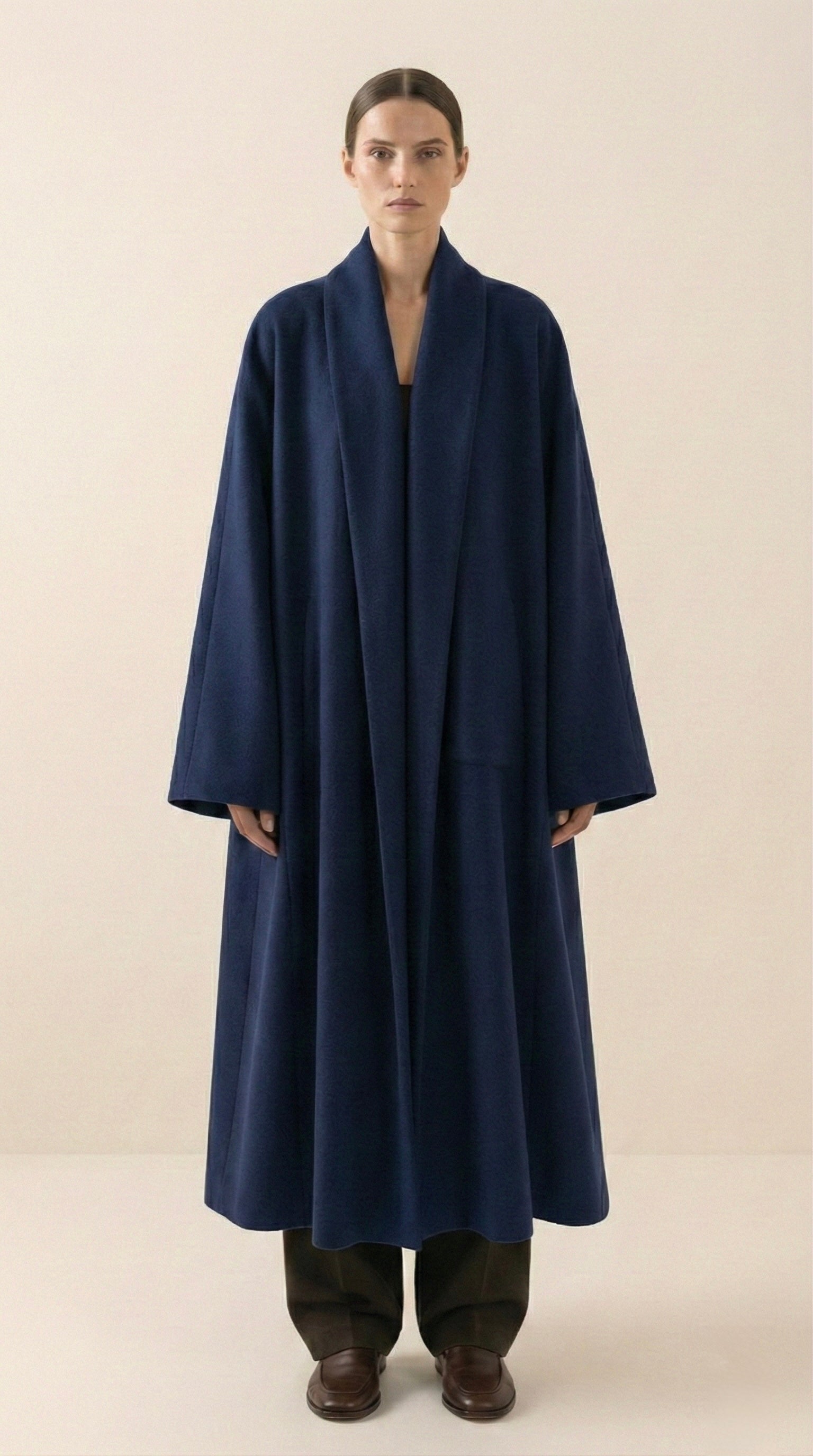 A sculptural, refined statement piece. This abaya coat is crafted from high-quality fluid modal and fully lined in silk for an exceptionally smooth, luxurious feel on the skin. The silhouette is wide, enveloping and designed to move with the body, creating presence without stiffness.